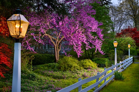 These three lamp posts made a nice framing element for the gorgeous spring tree.Unfortunately the lights were not working so I had to light everything with flash to get some light on the subject. This tree had a nice shape and wonderful color and the japanese maples on the edges added a touch of warmth as well.