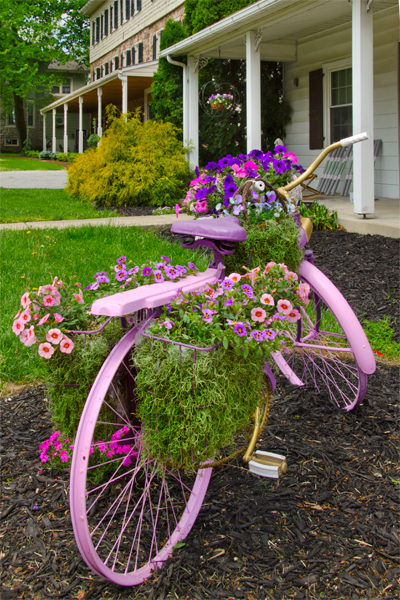 I happened past this simple yet elegant old bicycle painted in the most pleasant spring tones and adorned with a bouquet of spring flowers in both the front and back. Sometimes the simplest things are among the most beautiful and my hats off to the designer of this cool display. A dogwood in the distance adds just a touch of color to accent this lovely shot.