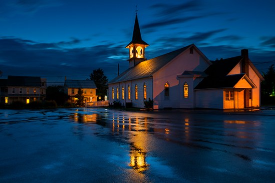 I was out looking for photos after it had rained one evening and I decided to shoot this quaint little church,which is in my home town. I set my tripod up in the middle of the street to get a view of the front when it started to pour after only taking about three shots, so I had to pack it in and as I pulled out in my truck I decided to turn around in the back parking lot and I was greeted by this awesome reflection so I set up again.This time I dug my umbrella out to battle the pouring rain again and as soon as I found the composition,the rain came to an abrupt halt and I had about two minutes to get the shot till the water ran off the lot and no more reflection was visible.Street lights added the extra warmth on the back wall.I have always liked this church because it reminds me of the ones I saw in New England years ago.