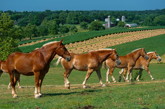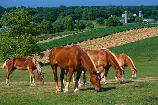 This set of three shots illustrates how well these horses listen to their Amish owner. I stopped to photograph them because they were starting to line up in a pleasing composition and the background was nice as well with the harvested wheat stacked up, when all of a sudden their heads pop up and they all look across the field with great attention. About two hundred yards away, I could see the farmer looking our way and although I heard nothing,they obviously did and just like that they all made a beeline to the barn. Not sure if the farmer just doesn’t like his horses photographed or perhaps it was feeding time,but whatever he did put a stop to my little photo session.