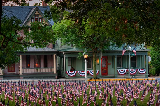 The fourth of July is a time to reflect,as well as a time to enjoy with family and friends, and one local town near me does its best to celebrate in grand fashion.That town is Lititz,Pa and it seems everyone gets into the patriotic spirit in town as the old red,white and blue proudly waves all over town. Most photos shown are from the Moravian church that has made a tradition of placing thousands of flags across the grounds in neatly lined rows,and the rest include a funeral home done very tastefully and a flag lined main thoroughfare.