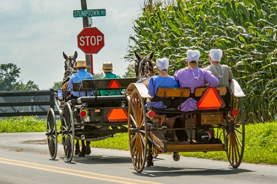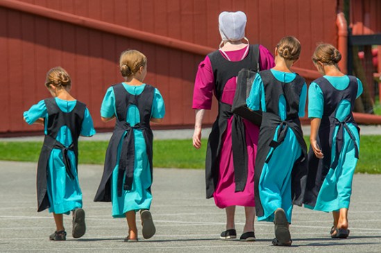 This was a real spur of the moment shot as I pulled up to a stop sign in small town Intercourse Pa,and saw these three Amish girls on some sort of cleaning excursion. I had enough time to roll my window down get three shots off and they were out of sight behind the bushes on the left. They are almost in perfect sync with their stride.