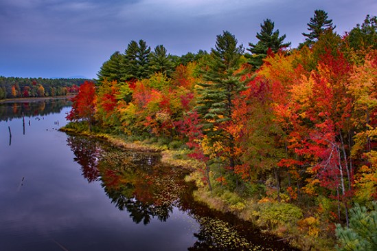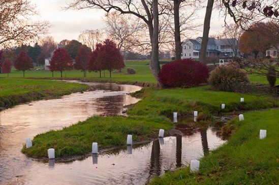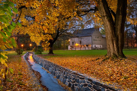 I really like shooting in the rain,but I hate trying to keep everything safe and dry while doing so. This was taken last night after I had the urge to shoot something fall related. This is a local historic site and I noticed the stone wall on this runoff area had been redone and thought it looked nice with water flowing through as it poured all around me. I would like to say I planned how everything lined up but in this case it was pure luck. I set up my composition before dusk and waited for the light level to drop and after sitting there for a half hour I noticed the two lamp posts on the left were lined up with my flowing water and I thought if only they would light up and reflect in the water. Now I know they had electrical problems with these lights last year and they were not working so I figured it was hopeless but low and behold they come on just when I needed them too. I actually wore hip waders here because I knew I might want to walk up the stream bed and I was glad I had them on.