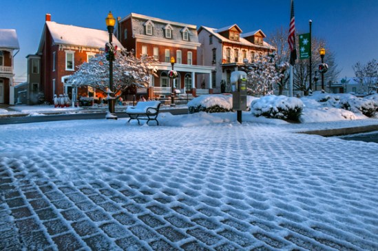 This was taken this past weekend in Lititz,Pa, and includes the snow-covered pine trees that they place along main street around the holidays. I blasted my flash from up the street facing toward my camera to try and light up the falling snow and it worked perfectly. Go ahead,take a walk back in time as the snow hits your face and Christmas music plays from the town square. The lighted building on the far right is an authentic English pub that is absolutely gorgeous inside.