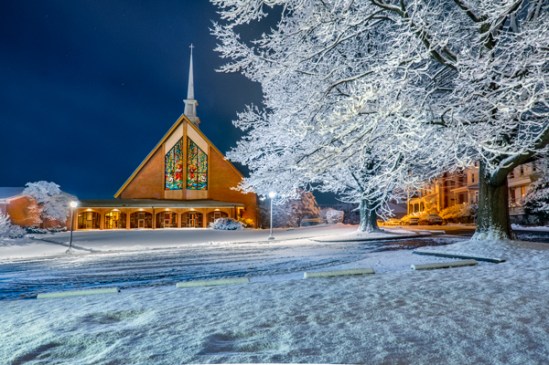 This is the last shot of the night from the last snowstorm and was taken around 11pm. I am actually standing with my tripod in the lane of travel on a busy highway and had to keep my eyes open for the occasional car. I noticed a janitor looking out the windows wondering who was driving the vehicle in the lot, so I ran up to the window and asked if there was any chance of turning on the sanctuary lights and he was more than happy to do so.