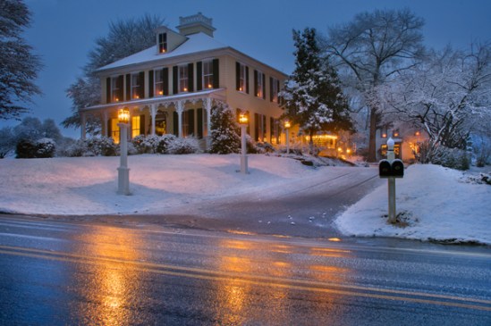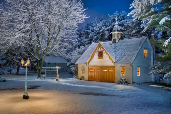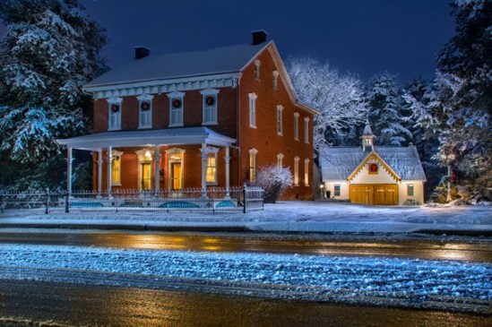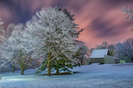 This property has always been a favorite of mine and as I drove by last week, I noticed the barn was illuminated with spotlights and the trees were wearing a heavy coat of fresh snow so I turned around to try this shot. I have my tripod on the sidewalk across the street and despite traffic being fairly light, I had several motorists drive by who were maybe a foot from the curb and were so kind as to splash slop at me. I quickly countered by getting a golf umbrella and used it to completely shield myself from their pitiful driving abilities. I did use their headlights to my advantage to help light the snow in the middle of the road. This night was very calm and was a night to remember.