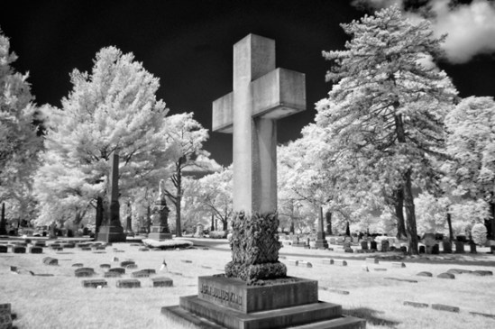 I found it ironic that the infrared shot has the windows looking like they are fully lit rooms inside. I looked at the original file and it looks like the windows were new UV glass that had a blue tint, which goes white with the filters.