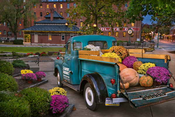 Another quaint fall image I captured in downtown Lititz,Pa this autumn. A local business owner got permission to park his classic old truck in the park with fall decor and allowed families to get pictures in it. For me the trucks contents were lacking a contrasting color so I literally gathered up all the purple mums we had at home and hauled them here to jazz things up. Mine are the five purple and two of the yellow