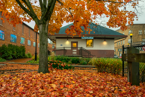 This image features what used to be a trolley/train station in a nearby town and it now is home to the local economic development team. It has a lovely courtyard on the opposite side which serves as a location for community based events to take place. The drizzly morning was just dark enough to allow the lighting to still register as autumn leaves frame the scene. Maybe a mug of warm apple cider or hot chocolate awaits your arrival inside helping to take the chill off and allow you a few moments to express gratitude for the beauty of the changing seasons!