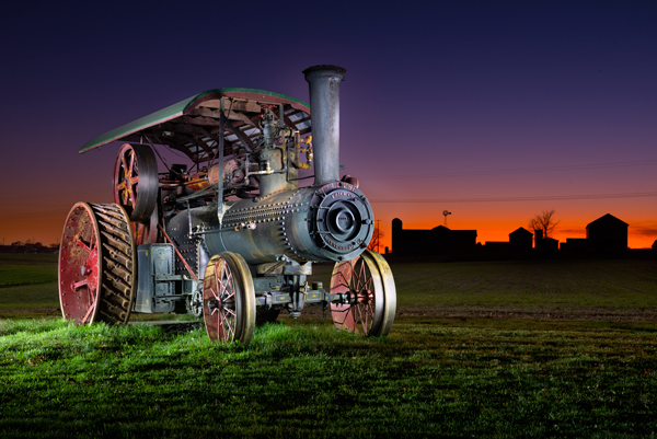 This old steam tractor from days past sits in all its glory with the sunset and silhouetted farm as a backdrop. I light painted this old tractor which is quite powerful and was very helpful in a multitude of farm operations. I believe the top wheel on the left can accept a huge belt that can power saw mill operations as well. I am very pleased with my result on this shot considering it was totally dark out in this field and quite cold to boot.