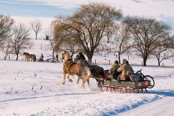 This sleigh just left the snow covered roadway as it heads across the field back to the farm. The two men in the distance are using a horse drawn plow to clear the driveway for the milk truck. You can see the old time bells around the horse on the left and they add such a pleasant sound as the sleigh approaches.