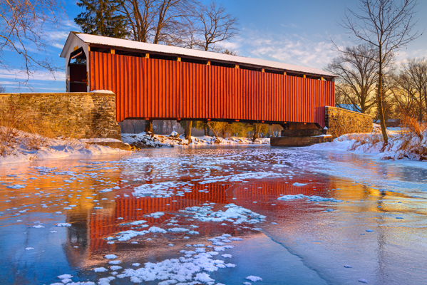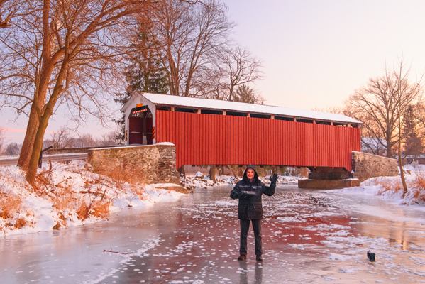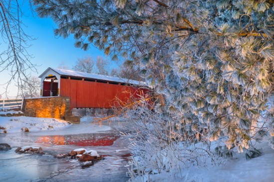 I will be sharing several different images from this local Covered Bridge I shot during the bitter cold snap. This particular morning Hoar Frost had formed on the pine needles of this stream side Pine Tree. The sun had just risen and was casting the first warm rays on the scene.