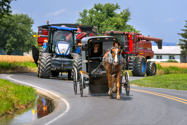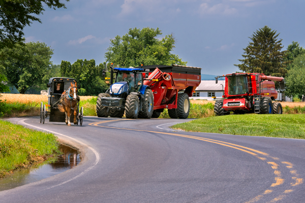 Lancaster County has a long history of farming and a long list of producing savory fruits and vegetables. Driving the backroads one can come across a wide variety of scenes that play out on a regular basis. This particular day I was heading home and as I approached this S-curve in the road I pulled over to figure out what was coming up the road in the distance. As you can see it was an Amish buggy that was dictating the pace for this harvesting team consisting of a large tractor that was pulling a large grain bin and behind that was a Combine and they both were headed to their next job. I was hoping they were going to pass the buggy and I could get the small buggy right beside the massive machines but they were taking it easy, probably because they saw the camera ahead. Harvesting has certainly changed a bit around here and what used to be a family affair out on the wagons has switched to hiring these crews that come in and harvest huge fields in very little time compared to the old way.