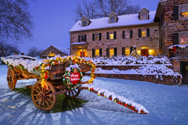 I recently mentioned that we were participating in what is known as The Ironmaster’s Christmas event where the mansion gets decorated with trees done by a variety of individuals and groups. Last year I wanted to photograph this wagon so I offered to help decorate it. This year it seems I was somehow voted on to do it again. This is what me and my wife came up with and to my delight it snowed while it was decorated. The Gruber Wagon Works is a National Historical Landmark located at the Berks County Heritage Center. This thing is solid and well made.