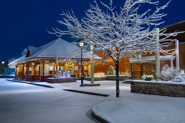 This is a former train station in a nearby town and I shot this a couple weeks ago on a quiet snowy Sunday Morning. I had been shooting in a light snow for about an hour when it suddenly stopped and you could just make out a hint of blue as sunrise drew closer. This right here is about the perfect time to shoot when the sky has gotten just bright enough that everything looks perfect. There are parking spaces all along that curb and usually you will see people park their cars here overnight. I hit the luck trifecta as 1, there were zero cars, 2, no plows had come through, and 3, there was no wind blowing to ruin the tree.