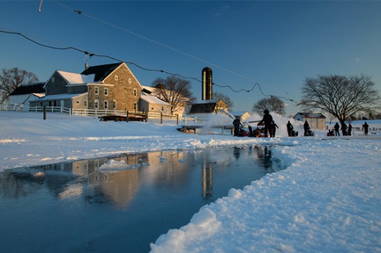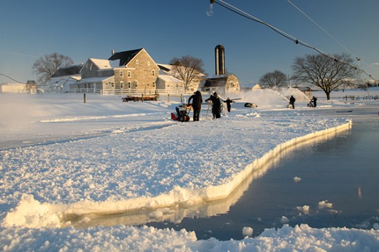 I was here well over an hour snapping away and at one point, one of the snow blowers found a thin spot so they backed away and basically created a no go zone. The water started slowing flowing onto the ice and at one point a young man about mid twenties got my attention and asked me to move away from the wet area. I had seen some potential shots with the farm reflecting in the water so I was looking for cool shots. The third photo shows the watery area on the right where I was standing in the water. So as you look at the photo, that patch of snow eventually had water around it on the left side as well so it literally looked like an island as you can see from the actual on my stomach shot before I got reprimanded. So as usual I am focused on potential photos and when the water covered the left side I ended up crawling on my stomach across the snow to get the farm reflecting shot. It was at this point I heard a serious SIR, would you please move off that section, SIR, this is the second time I had to tell you to stay off and I do not want you to fall in and have to be rescued! That section you are on is starting to slowly sink. In his defense, he was wearing a fire fighting jacket so he probably has been trained in potentially dicey situations. I honestly did not have any fear of going through the ice but when he noted it was slowly sinking, I made a hasty retreat. All in all one of those photo memories that I will remember for a long time