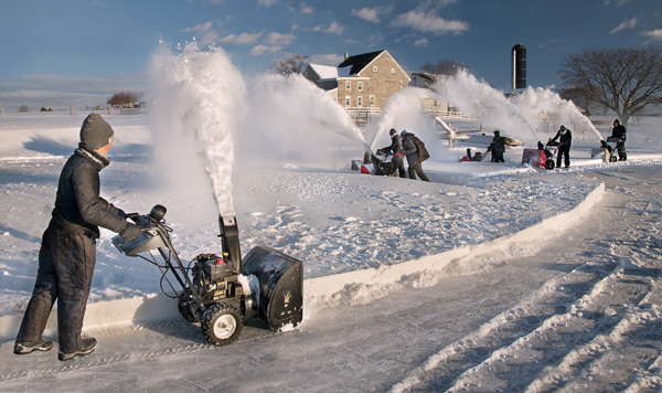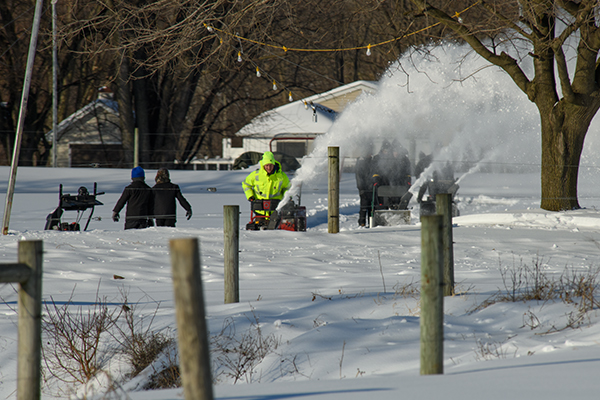 So I had just turned into the lane when I see a Bobcat headed my way figuring I was about to be told, hit the road buddy! As he stopped to talk to me, I gingerly asked if there was any possibility I could go down to the pond to snap some photos of the snow blower crew in action? To my absolute surprise he said sure your welcome to head on down. There was snow flying in every direction but there was a methodical approach that was well orchestrated. in the long distance photo there are five guys following each other to progressively clear the pond. The second image is my personal favorite because of the sheer number of teens and men at work throwing snow and the two in the middle doing a criss cross pattern were icing on the cake. Something else I started to notice was the younger boys were starting to move in front of me and they would watch where I was pointing my camera so they could slip into as many shots as possible. At one point it was starting to ruin many good shots so I would point my camera one way and as they were moving I would swing toward the real subject and capture the real subject.