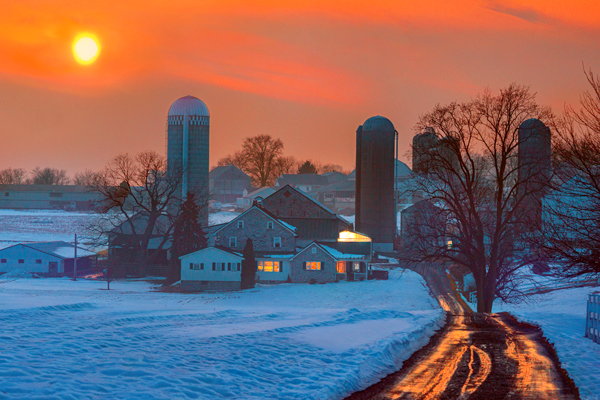This image was taken on Tuesday Evening and two days later I still can’t shake the experience! This farm is one that has been on my radar for a while and I like it because of the long lane leading in and the multitude of structures that stack up in a long lens shot. I headed here because I thought the sun would be a big subdued orange circle due to the misty air resulting from snow melt. Shortly after this shot the sun faded behind heavy clouds and never showed itself again. So all was well and good and their is a house to the right just out of frame. A Mother, father and their young daughter came out and walked up the lane to get their mail which was right in front of me by the road. I snapped a few shots of them walking toward me because they were all holding hands and I thought it added a nice touch to the shot.