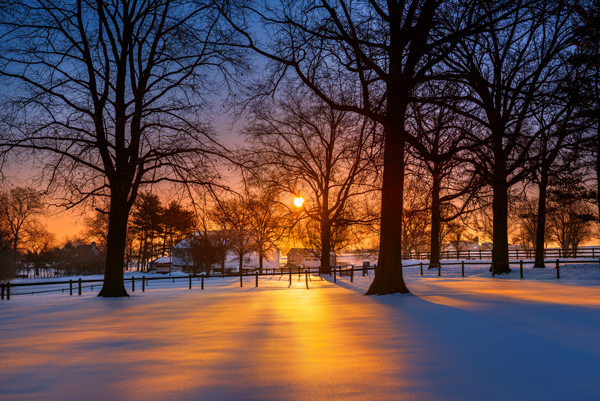 This beautiful property is the home of a local therapeutic Horse riding Facility. I was given permission one bitter cold morning to go into this pasture to capture the sun coming up behind these magnificent trees. The Horses were all comfortable inside the stable while I was outside freezing to capture this shot. We had a nice coating of shimmering ice on top of the snow for a week or so and one warm day took the shine away slightly but this will do.