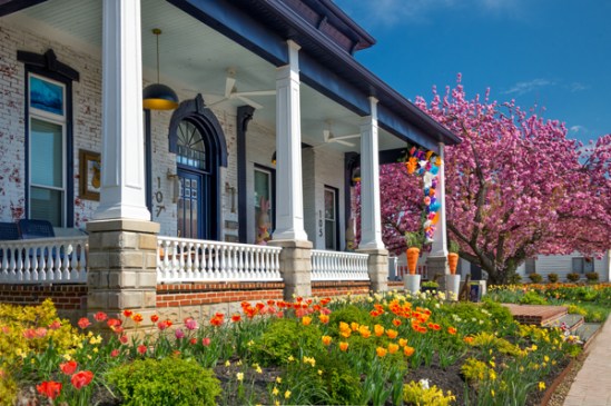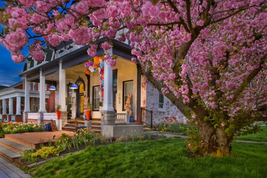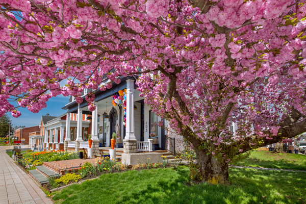 This property used to be run down and neglected but a few years ago it was sold and the new owners have transformed it into a real gem within the community. The wife takes much pride and joy in decorating the porch for various times and events taking place through the year and her husband is right there to help insure things go as planned. The gorgeous flowering tree only added to the beauty.