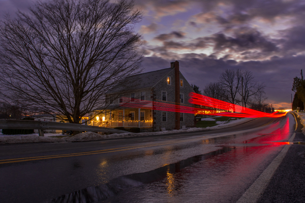 Now I come to the reality that I literally need to have my tripod at the edge of the road to get the color and reflection to show and with my tripod as low as it goes, the legs extend almost 2 feet out from the camera position. When I first set up, it was very light out and my genius plan was to stand right beside my tripod at the edge of the road so cars would give me a wide berth because it appeared I was ready to cross the street to the house. Everything is going great and everyone is going wide as they pass, but then I start to notice its getting darker and cars are seemingly getting closer. Right about then I hear this pickup truck thundering down the road in my direction and I stay put and he never so much as blinked an eye as he passed me about 2 feet or less. I was thinking the guy was trying to send a message, but then I looked at my attire and I had on dark blue jeans, a black sweatshirt and brown hat and I realized he never even knew I was there. The red streaks are his tail lights as he blew by me. The sky did in fact get better but I keep asking myself why so risky for this so-so image?