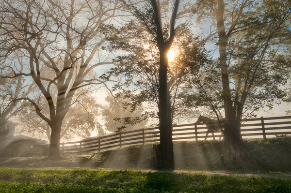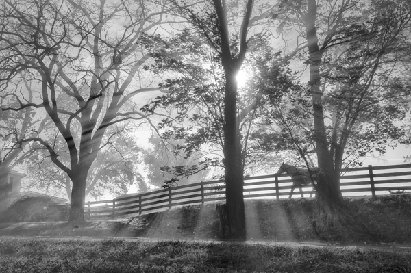 I think each version has its own merits but I am leaning toward the black and white version? This was a very foggy morning and I knew there was a horse off in the distance that I hoped would come to the fence. He eventually did but never gave me a full profile and I was sure two more steps forward and I would have nailed it, but of course he turned his head down and to the right as he moved so this was the best I could get. The rays were even more distinct than they appear here and they were going out in all directions.