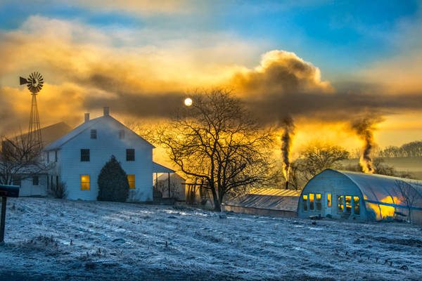 I came across this farm scene after our last heavy snow and took a few handheld shots before I noticed the Amish farmer watching me from a small shed off camera. What made me notice him was every time I fired off a series of 5 shots, I would immediately notice a whistling sound that mimicked my shutter firing. I figured it was his way of showing me was not happy. After about ten minutes I notice him heading my way so I simply packed up and off I went. Then this evening I decided to see what sunset was like at this farm, so I pulled off the road and set up and again I see the farmer heading out.