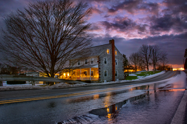 This is another shot I did on New Year’s Eve in Lititz, Pa. It is the former production factory for Wilbur Chocolate which moved manufacturing locations and thankfully someone had the vision to revamp it into luxury condos. Just behind me is the Wilbur Chocolate retail store that still offers Wilbur Buds and other goodies. I already had two angles captured of this building and was ready to leave when the rain got heavier and started puddling and providing lots of reflective possibilities. The camera was fairly low which put it in the splashing rain zone which added to an already challenging shoot. The bottom photo is my attempt at creating a more painterly look like a painting on canvas. I have two more angles to share from here. One little bit of luck was the fact that I went back to shoot some more two days later and three quarters of the front had white tents set up for outdoor dining so I caught a break on that one.