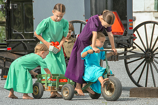 These five Amish siblings were busy loading and transporting tomatoes to market recently as the season is winding down quickly. Lucky for them the destination was only 25 feet in front of them at the families roadside stand. The old saying, “many hands make light work” is exemplified by these ambitious youngsters. The young driver only has her learners permit, so her instructor helped her navigate,all while getting a free ride!