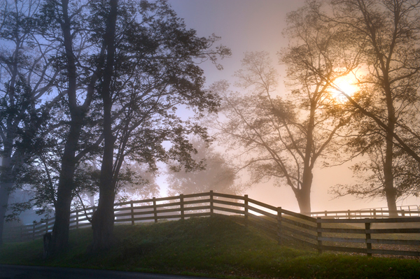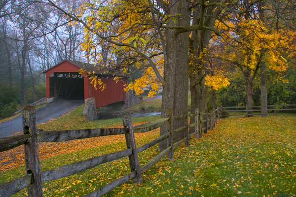 This covered bridge is framed nicely by the fence and yellow leaves and a light fog in the air added to the peaceful scene. That was until a car came from the other side, stopped inside the bridge in the middle and began cranking out some music? This lasted a good five minutes, then the horn honked a few times and out the driver came, all by himself? I know the horn honking is an old tradition but why the music first will remain a mystery I guess. Maybe it was remembering an old flame that made the trip with you years ago?