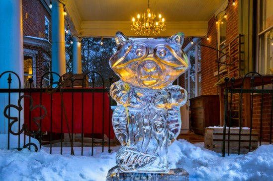 I cannot definitively say this is a racoon hugging a tree stump but its my best guess. This sculpture was part of the Ice Festival in Lititz and I knew as it got darker the light from the Chandelier was going to help bring some internal color out. Another cool sculpture of ice to celebrate Winter activities.
