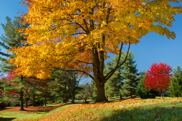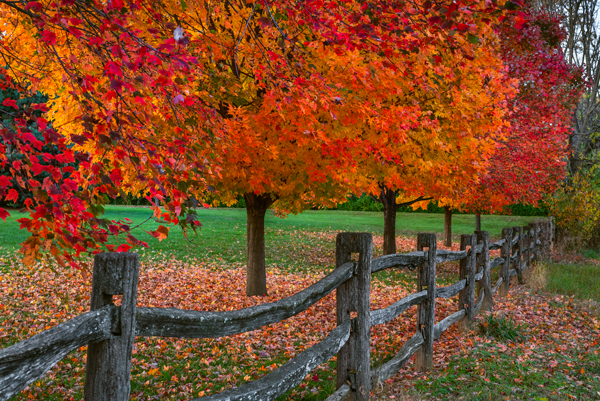 So as I evaluated my error and considered the lay of the land around me I decided to climb a hill behind me. As I got up the hill I noticed that bright area of fallen leaves to the left of the tree and thought if I could get one more buggy passing, I could get what I was after! I waited maybe five minutes and not only did a buggy come but he actually turned into the farm lane which made him stand out clearly against the fallen leaves giving me more than I had hoped for. Surprisingly this is one of my favorites from this fall season because of several points. First I feel the composition is perfectly balanced, it gives you a feeling of going home, the yellow maples, two red barns and two red maples just make a pleasing autumn scene and the horses eating in the pasture add a nice touch! So explore the options wherever your journey takes you!