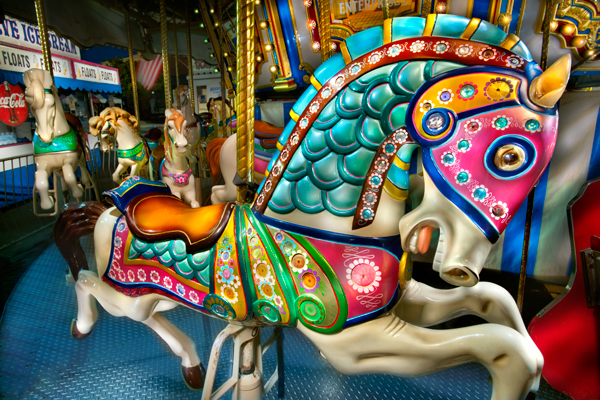 Fall is the time when the annual street fair comes to town and this carousel was calling to me to do a little light painting. Both myself and my good friend headed out before sunrise to do some shooting at the empty fair and I settled on this particular horse with its cool color scheme as my subject. The first glitch I ran into was the street lights were pretty bright,so my longest exposure was around 8 seconds,which limited my flashlights ability to be the strongest light source. I went to plan b,which utilized flash with a snoot attached and that puts the light beam in a very narrow area across the subject. The flash was attached to an extendable pole to allow positioning it wherever I needed without standing on the carousel and having it move . This shot is the result of maybe 30 flashes throughout the scene,including the ice cream stand on the left. Carousels seems to have a magical quality that captivates the imagination and transports you to another world.