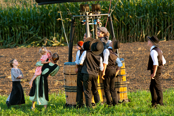 After following this hot air balloon one evening, it finally landed at an Amish farm and these young people came out to see the balloon being packed up.I shot this from across the street with about a 400mm lens as the audience looked up into the balloon. The young men actually happily pitched in to wrap the balloon up and carry it to the trailer.