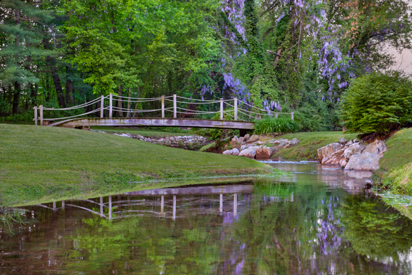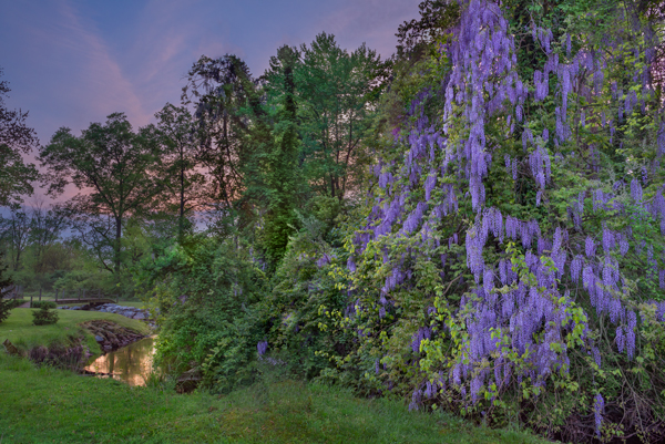 I was driving the back roads when I glanced between houses and noticed this lavender/purple flowering plant growing in a large patch amongst the trees. They went very high up and I found them quite appealing. The top image is taken from the road and that was as wide a shot as I could get without including houses on each side. The Azalea was much bigger on the left but I needed to crop off the bricks of the house showing through. The second image was looking up the stream towards the neighbors property where you can just see the bridge shown in the bottom photo looking the opposite direction. I had to talk to three separate homeowners to get access to shoot but all were very gracious. I am leaning toward it being Grape Hyacinth but I may be wrong.